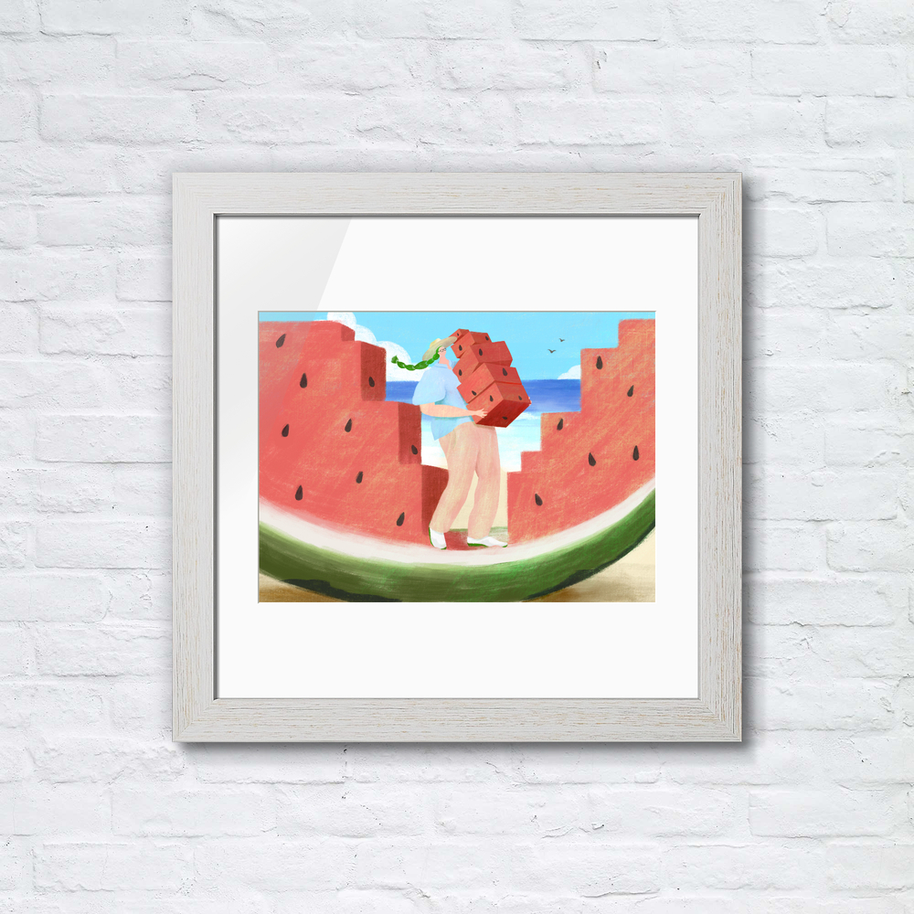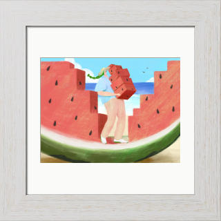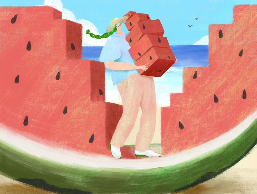 毎年夏になると、南の島の浜辺にそっと姿を現す“スイカやさん”。 お店らしいお店も、看板も値札もありません。 ただ大きなスイカを抱えて現れ、「食べ切れるかなあ?」とつぶやきながら配りはじめるのです。 潮の匂い、波の音、そして甘くて冷たい四角いスイカ。 島の人も旅人も、みんながこの季節をひそかに楽しみにしています。