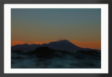 水平線の彼方にそびえる荘厳な山脈を、燃えるような夕焼け(または夜明け)の空の下で捉えた、コントラストが美しい風景作品です。前景の水の揺らぎと、後景の静かな山のシルエットが、対照的ながら調和したドラマを生み出しています。