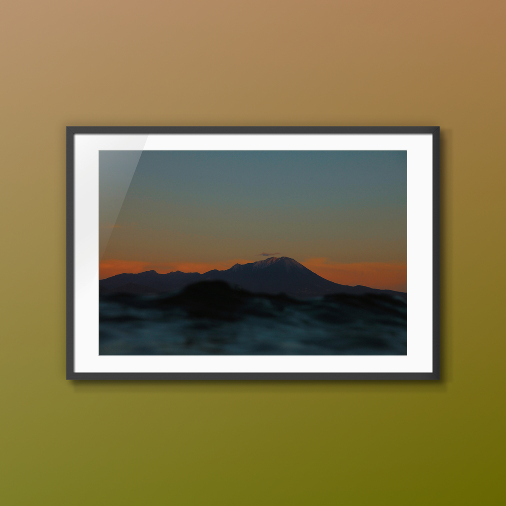 • 手前の海面(または水面)は意図的にぼかされており(浅い被写界深度)、波のうねりが抽象的なテクスチャとして機能しています。このぼかしが、鑑賞者の視線を中央の山へと集中させ、風景に奥行きと幻想的な雰囲気を与えます。
