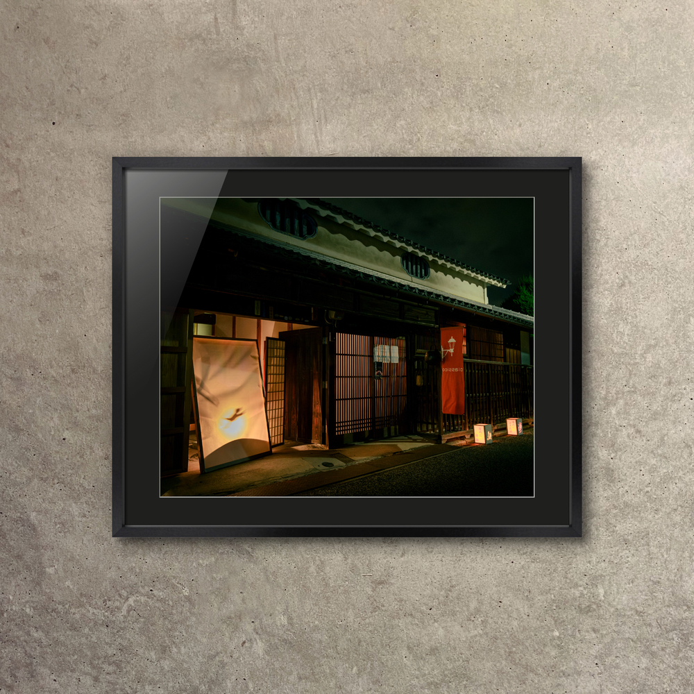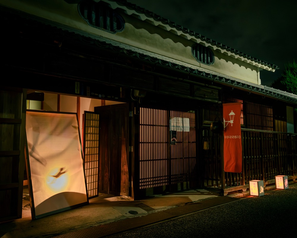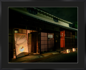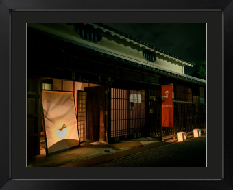 夏のイベントの夜です。店の暖簾に映し出している影絵が懐かしいです。