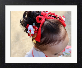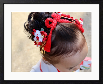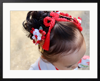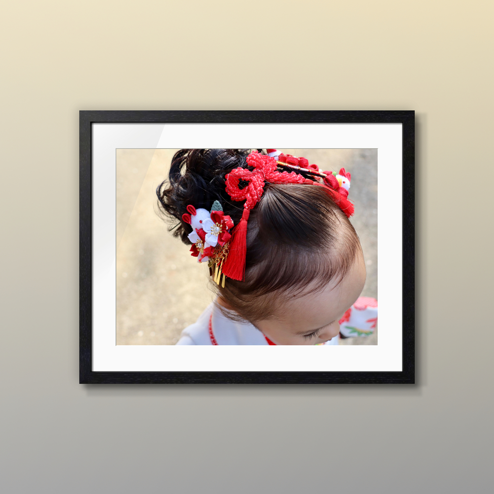 これぞ日本独自の七五三文化を象徴する伝統の髪飾りとヘアスタイル。 女の子の成長のお祝いとしては、世界に誇る和の美。 晴れやかな祝福の空気も感じ、特別で上質なアートピースとしてコレクション、インテリアやギャラリー展示にも、 日本独自の七五三文化を象徴する伝統の髪飾りとヘアスタイルの定番写真として、最適です。