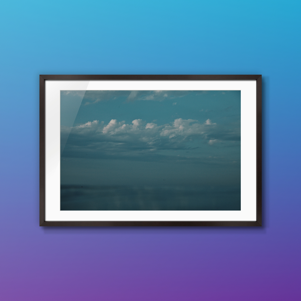 まるで窓の外の美しい景色を切り取ったかのような、穏やかな空と雲の様子を捉えています。落ち着いたブルーとパープルのグラデーションの背景に、シンプルな黒いフレームがモダンな印象を与えます。 どんなお部屋にも馴染みやすく、飾るだけで空間に広がりと安らぎをもたらしてくれるでしょう。リビングや寝室はもちろん、オフィスの休憩スペースなどにもおすすめです。空を眺めるように、ゆったりとした気持ちで過ごしたい時にぴったりの一枚です。