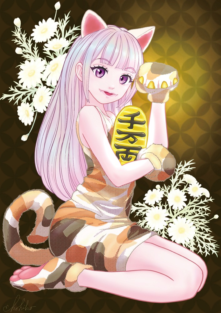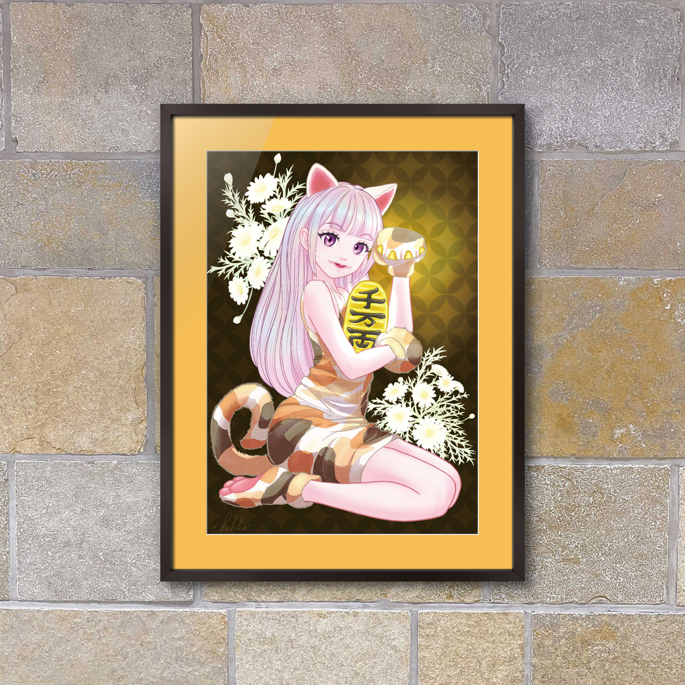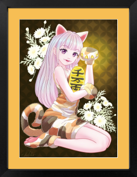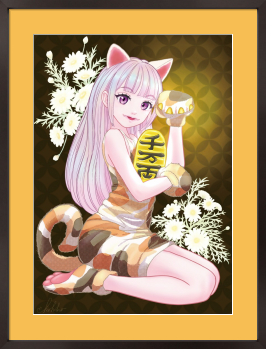「千客万来」をテーマに、招き猫を愛らしい女の子の姿で描いたイラストです。 柔らかな微笑みと華やかな色彩が、お店に幸運と賑わいを招いてくれるように仕上げました。 スナックや居酒屋、飲食店のインテリアとしてはもちろん、開店祝いや周年記念のプレゼントとしても大変喜ばれる一枚です。 お客様を迎える空間に、明るい福を呼び込む存在としてぜひお役立てください。
