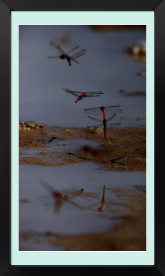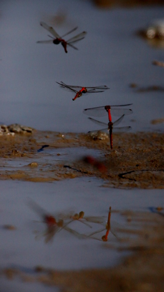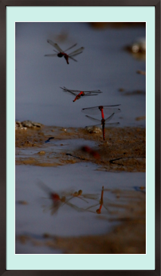 The dragonflies are flying in tandem and laying eggs in the puddle, formed after considerable rain from the previous day, on a narrow path between vegetable fields. In a couple of hours the water will evaporate, then, where are they going?