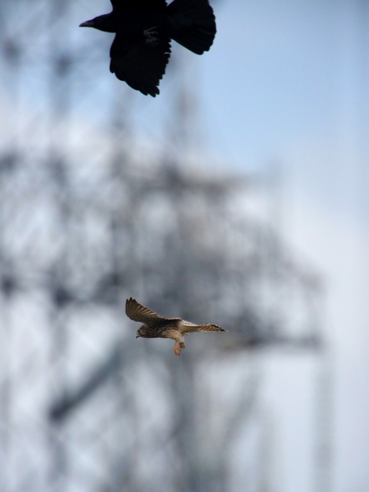 A juvenile common kestrel - below, and one of the crows ‘mobbing’ all day - above. Usually 3-4 crows work together surrounding one tiny falcon.