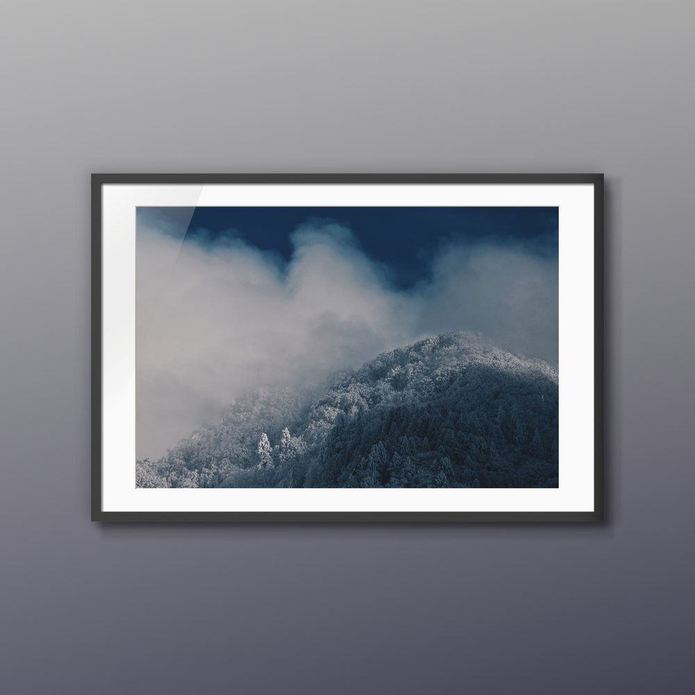 都市の喧騒から隔絶された、冬の山頂。深い霧と雪に閉ざされた一瞬の静寂を切り取りました。この一枚が、あなたのリビングに「深呼吸」をもたらし、忙しい日常を忘れる癒やしの空間を創り出します。