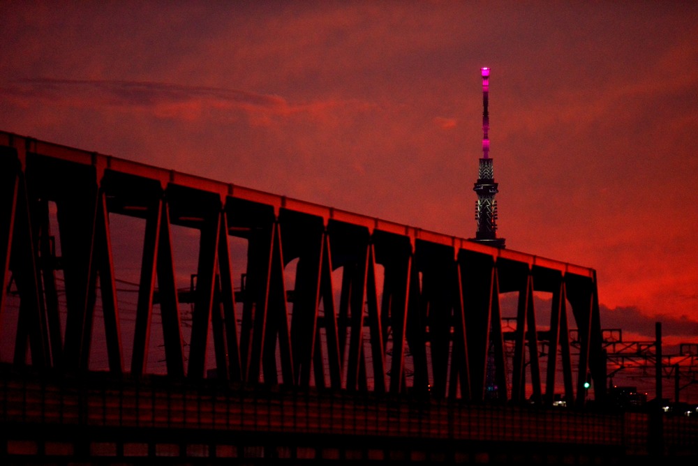 9月の夕暮れ時、夕陽を反射する鉄橋、背後にはスカイツリーも聳えています。お気に入りの江戸川風景の一コマです。 A railway bridge was glowing under the late September sunset, with Skytree behind. This is one of my favourite spots along Edogawa River.