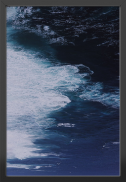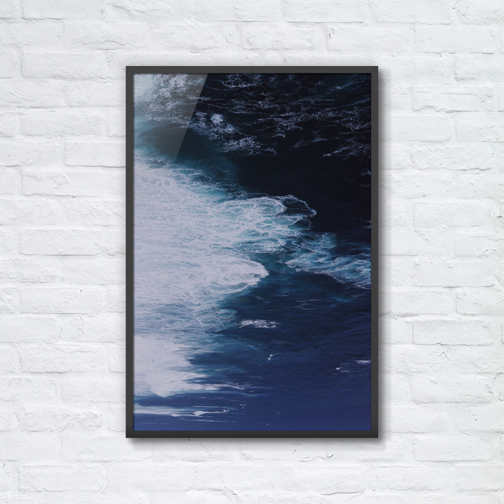 • 色彩の深み: 深く豊かなインディゴ、コバルトブルー、そしてほとんど黒に近い色調が、波頭の純粋な白と劇的なコントラストを生み出しています。自然の持つ力強い美しさと、静謐な深遠さを同時に感じさせます。