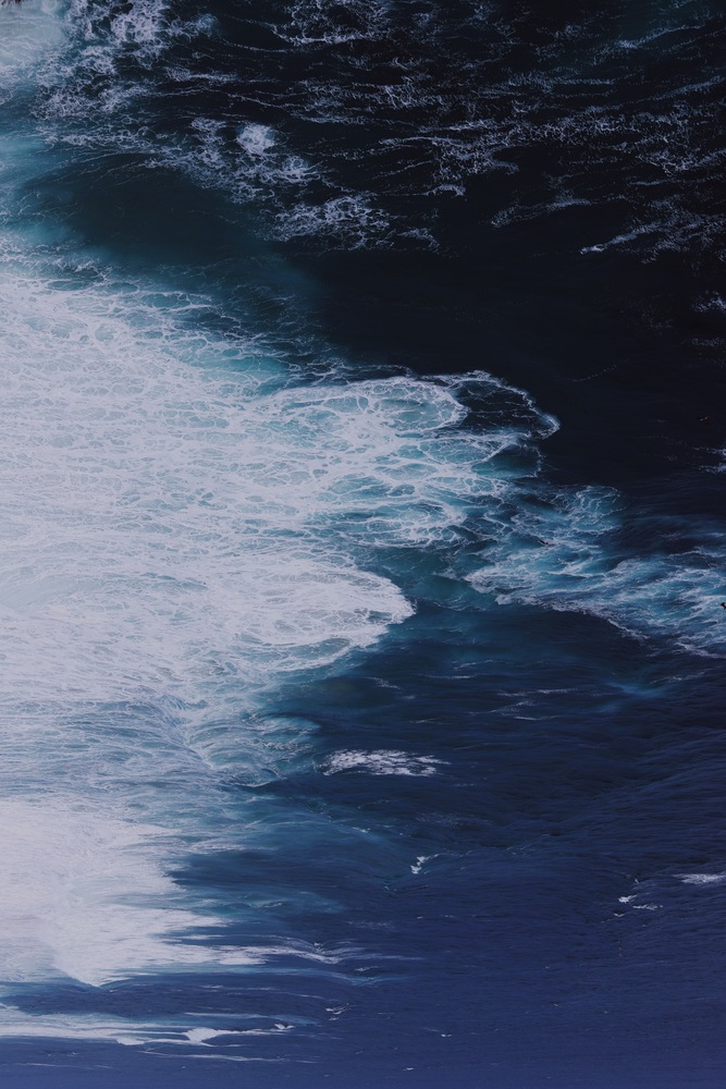 作品は、上空から捉えられたような視点で、広大な海のダイナミズムを捉えています。画面上部は濃紺や黒に近い深海の色に覆われ、下部に向かって波が砕け、白い泡となって広がる様子が抽象的な筆致のように表現されています。縦長の構図が、無限に広がる深淵と、エネルギーに満ちた波の動きを強調しています。