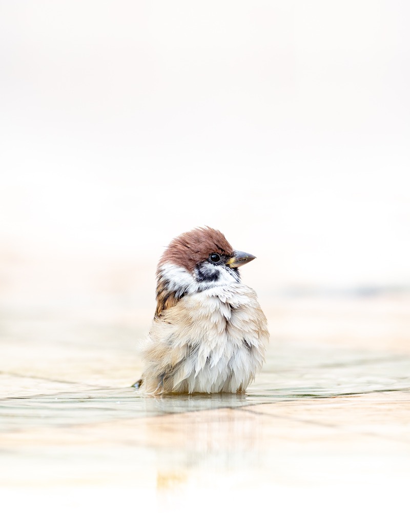 水たまりで水浴びするスズメ。なにかに気を取られている表情をとらえた。