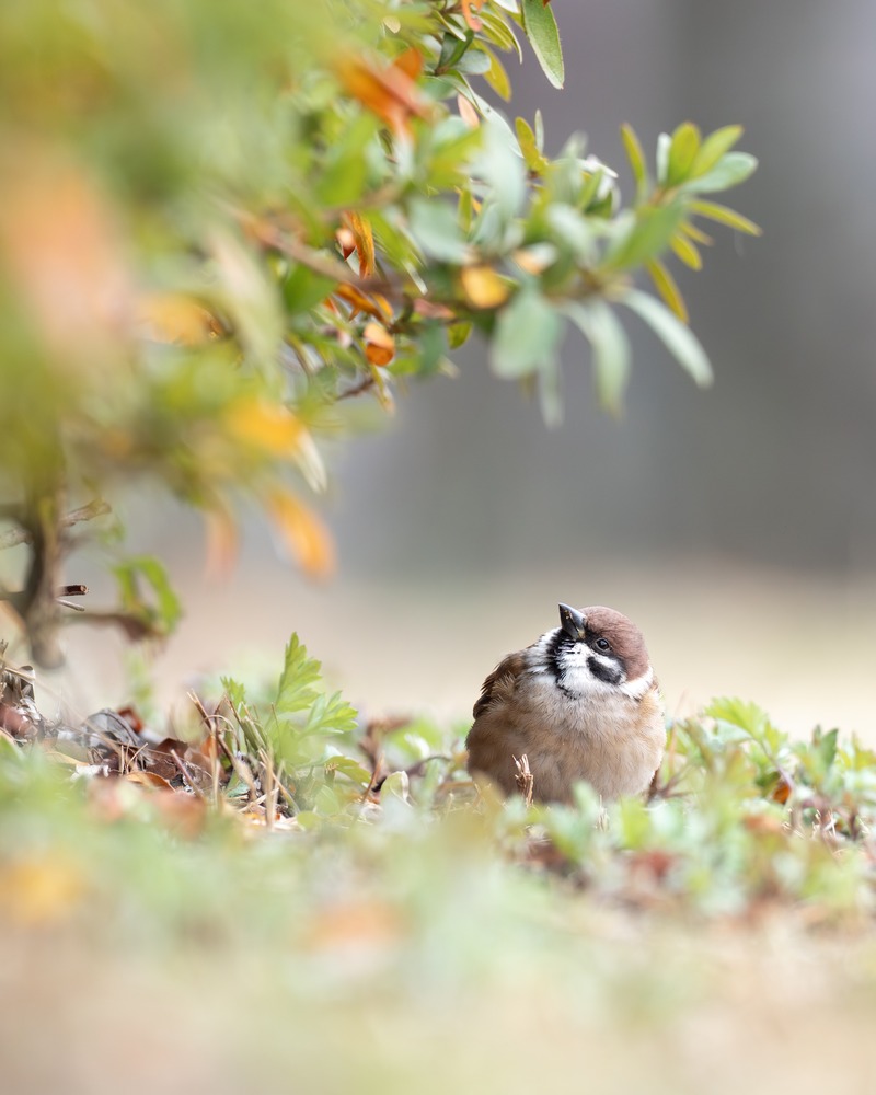 地面で食べ物を探していたスズメ。ふと上が気になって見上げた一瞬の表情。