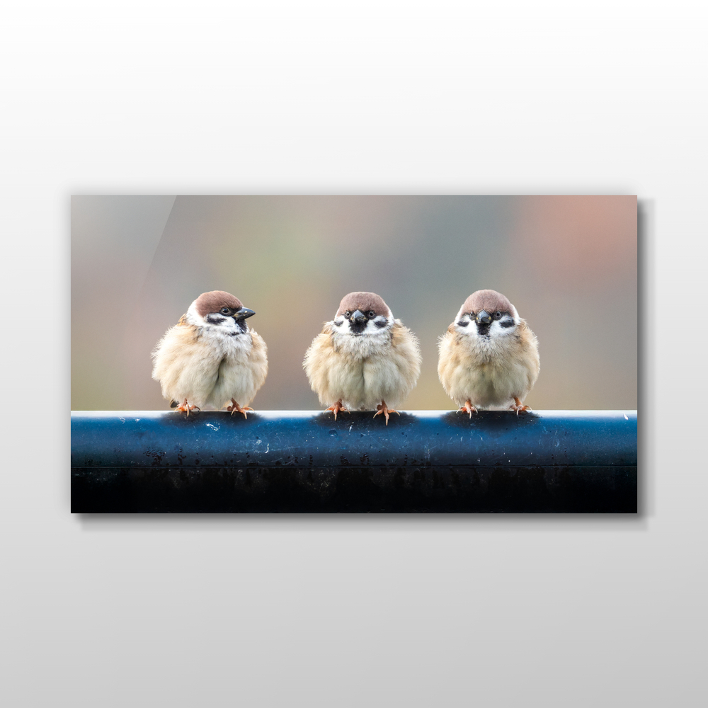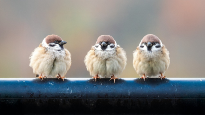 3羽のスズメが横並び そっくりだなと言わんばかりに、横を向くスズメが愛らしい