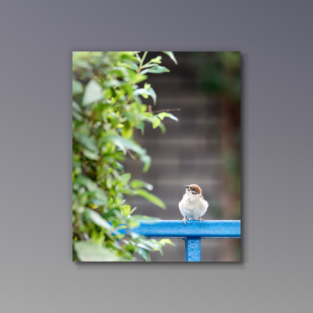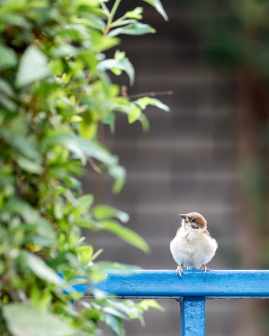 鮮やかな青い柵に止まったスズメ。まだあどけない表情の子スズメだ。