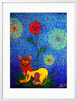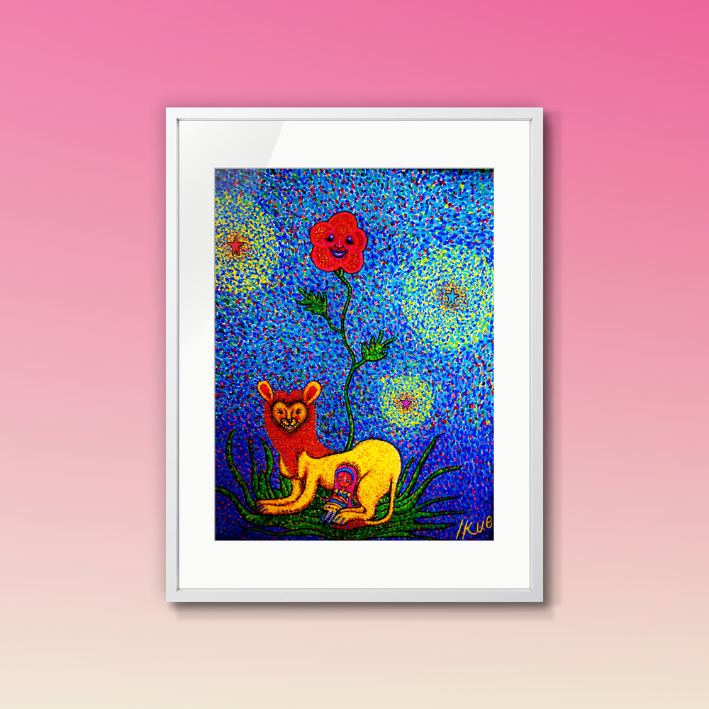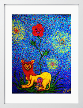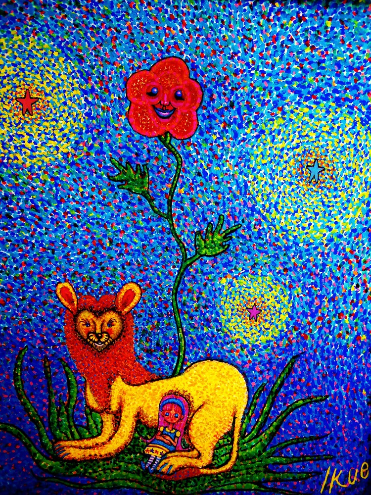 技法 点描画 平和の祈りを込めて、 肉食獣のライオンの 傍で眠る少女を 描きました。