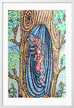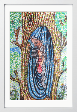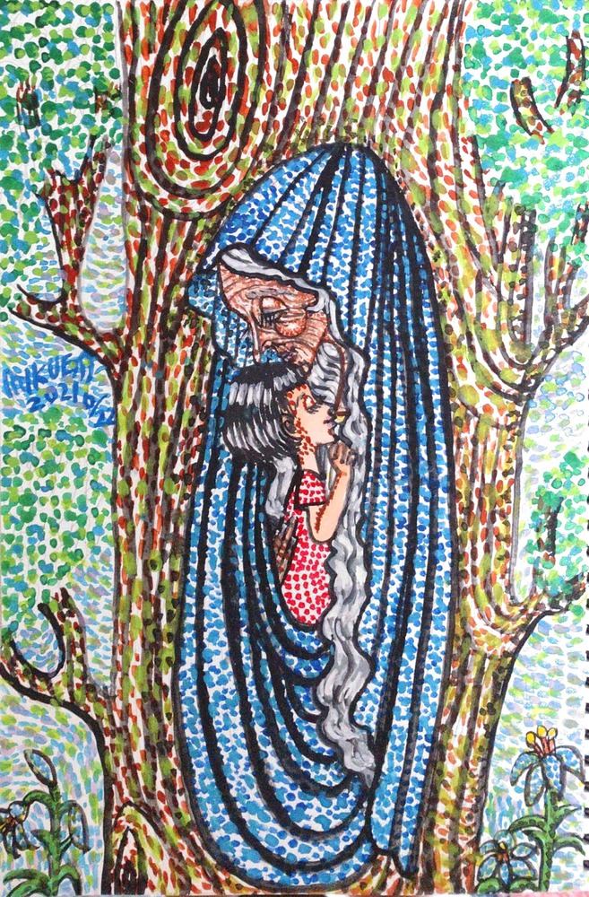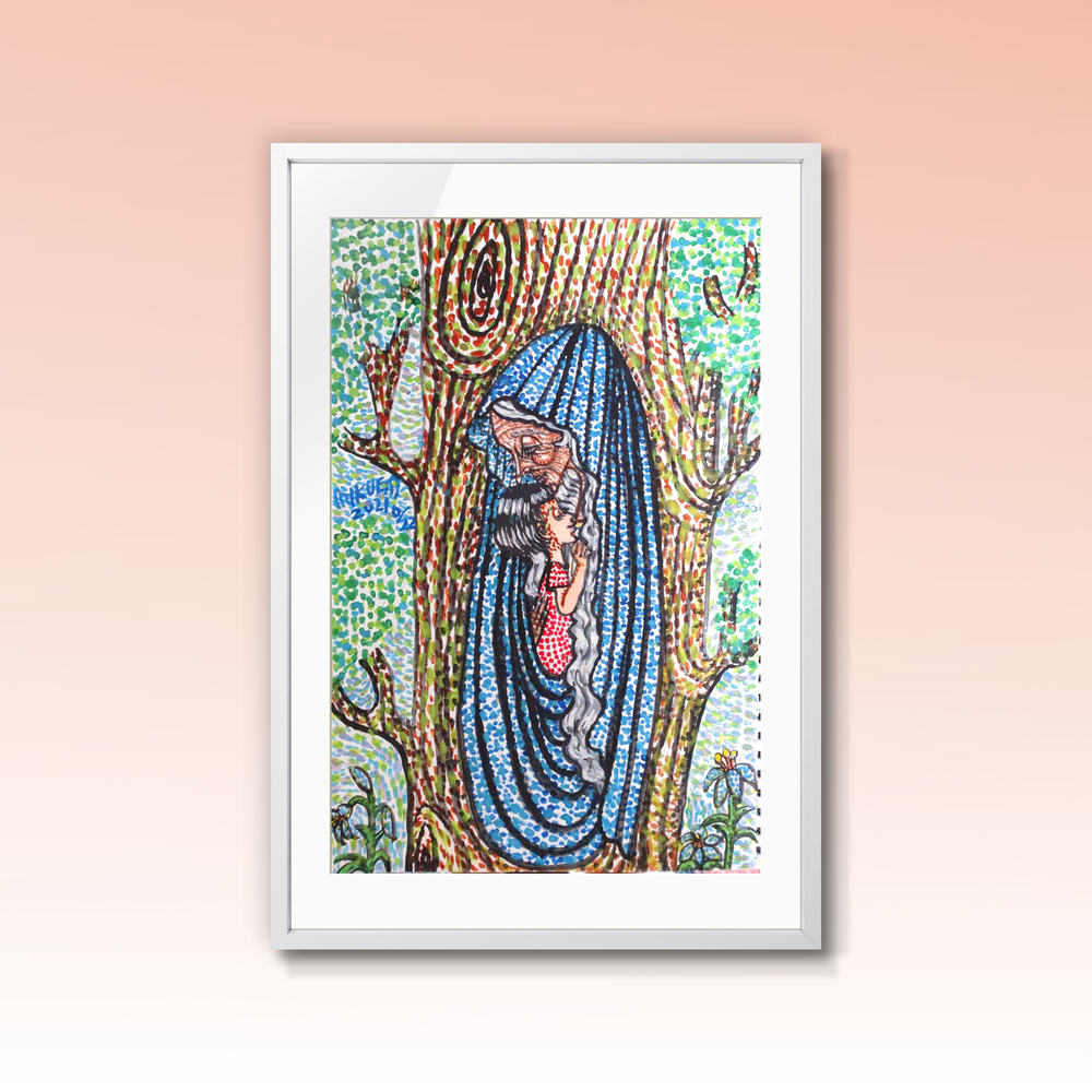 画材 アクリル絵の具 技法 点描画 子守りをする妖精が 子供を抱きしめて 額にキスをする母子像。