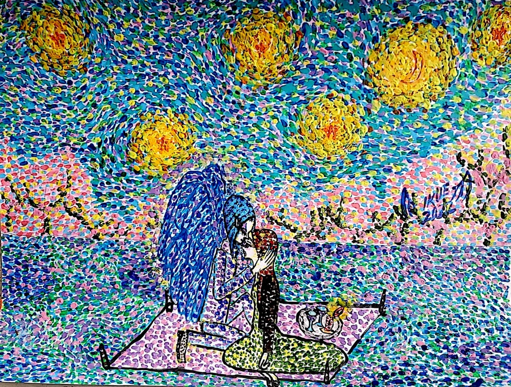 画材 アクリル絵の具 技法 点描画 星空の下で 青い髪の妖精と 寄り添う少女。