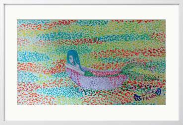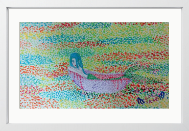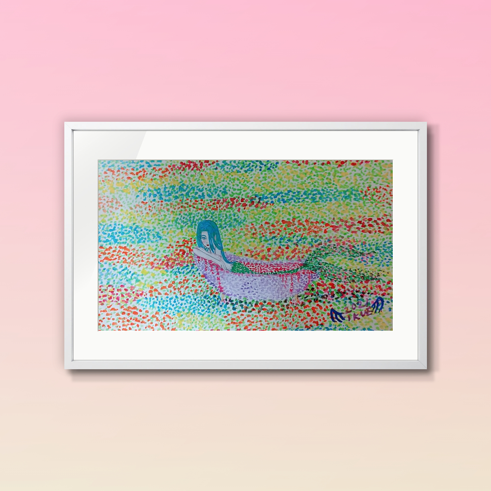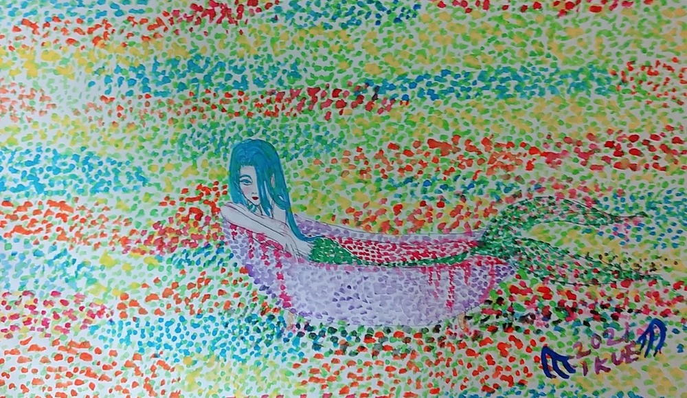 画材 アクリル絵の具 技法 点描画 ファム・ファタールを テーマに描いた。 花園の中で誘惑をする人魚。