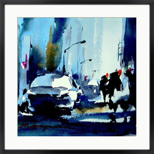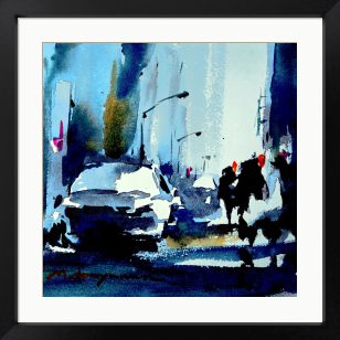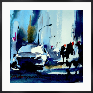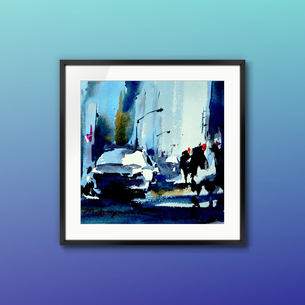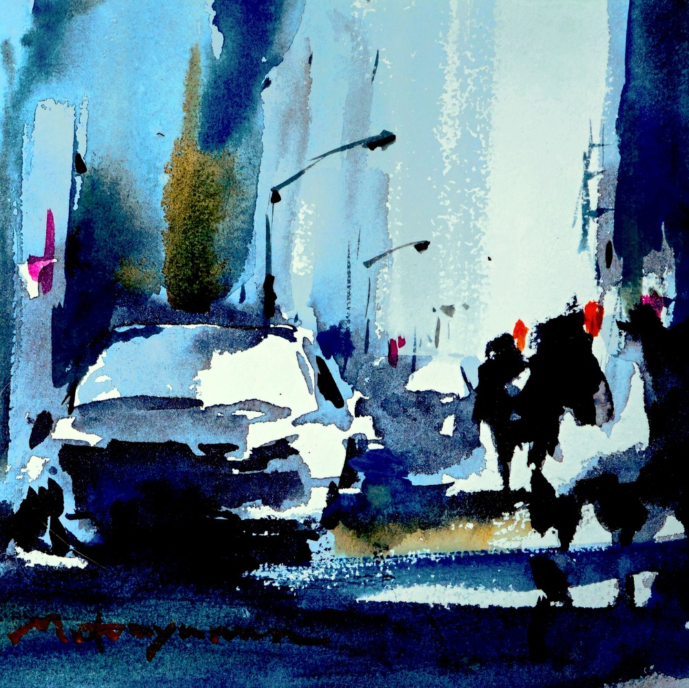 交差する光と影。人と車が行き交う瞬間に、都市の鼓動とリズムを感じて描いた。