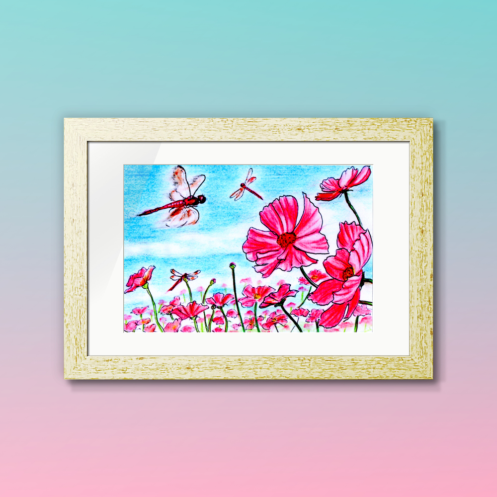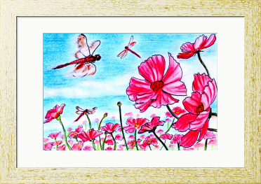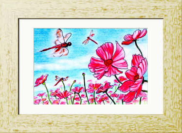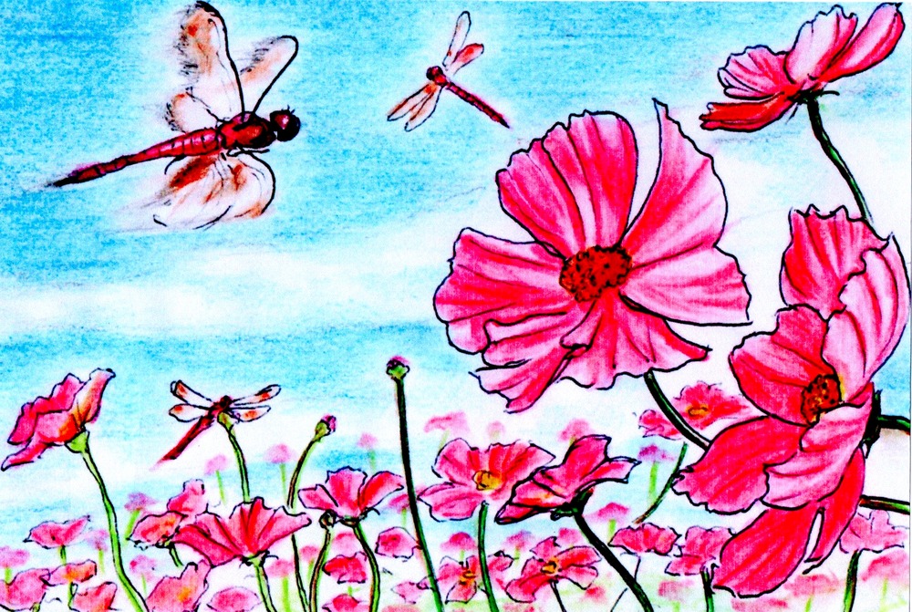コスモス畑を自由に飛び交う赤とんぼを描き、秋らしい風景を表現しました。