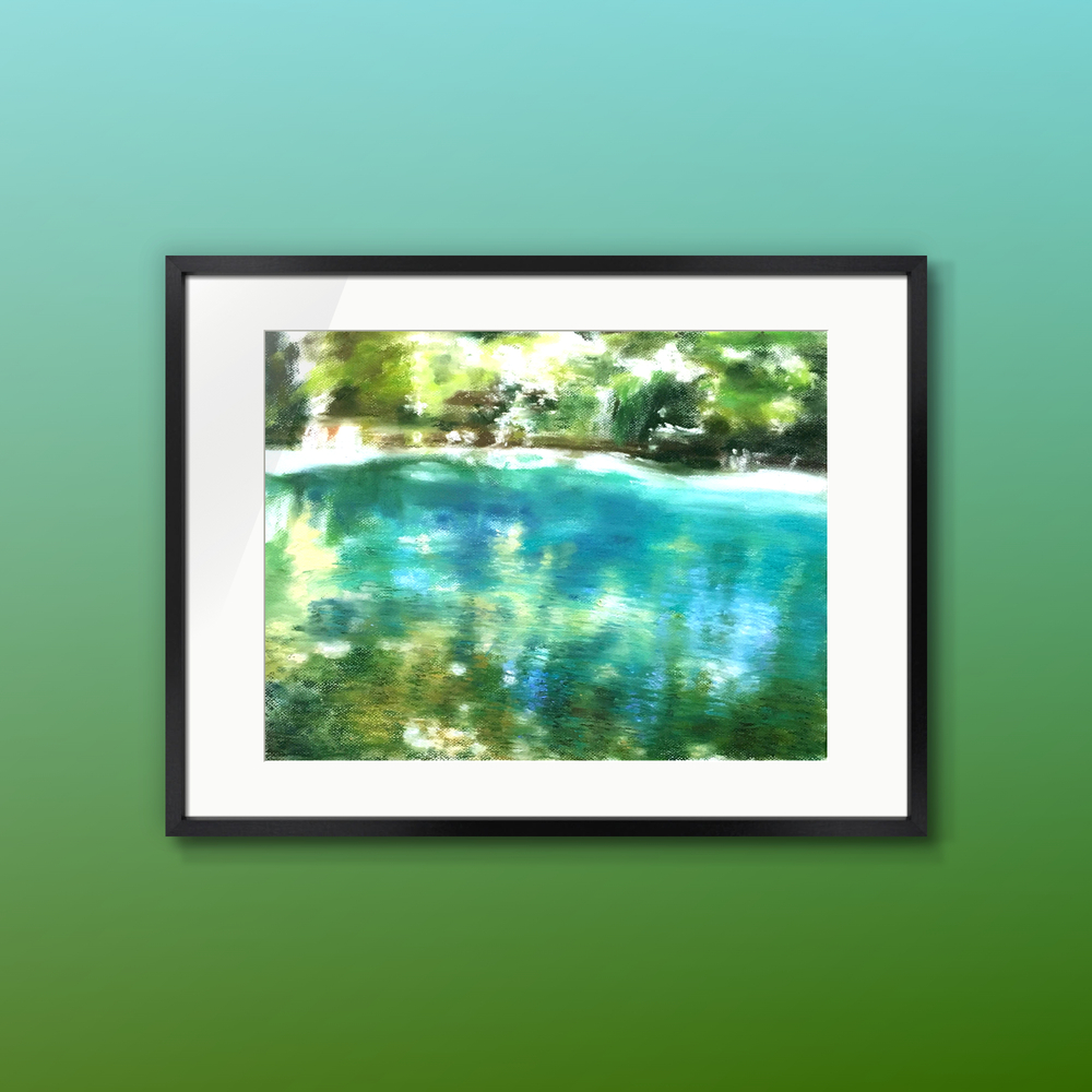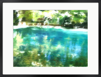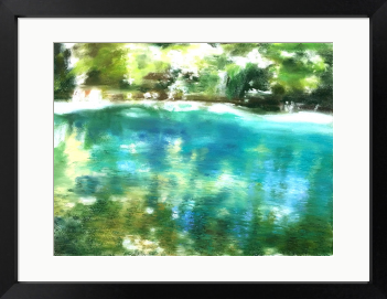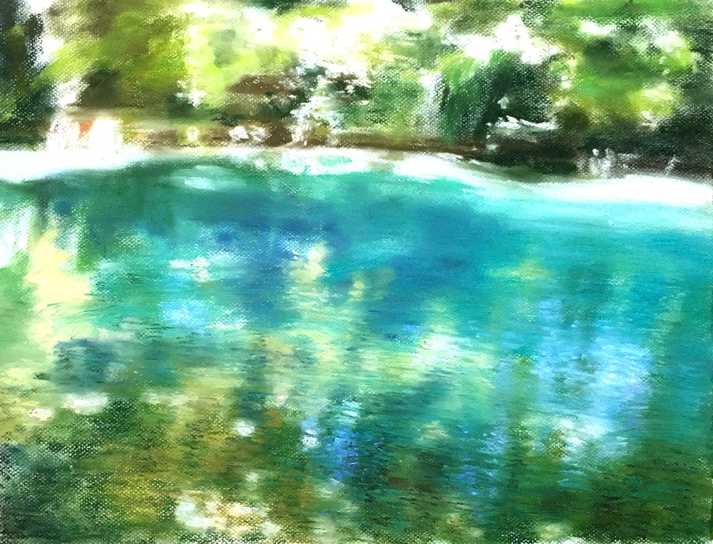この作品は、ヨーロッパを旅していた時に出会ったスイスのインターラーケンに流れる川をモチーフに描いた作品です。豊かな森、高山から流れる川の水面は、ブルーグリーン色でとても綺麗で神秘的でした。 水面に反射する光、色、透明感を大切に描いた作品です。