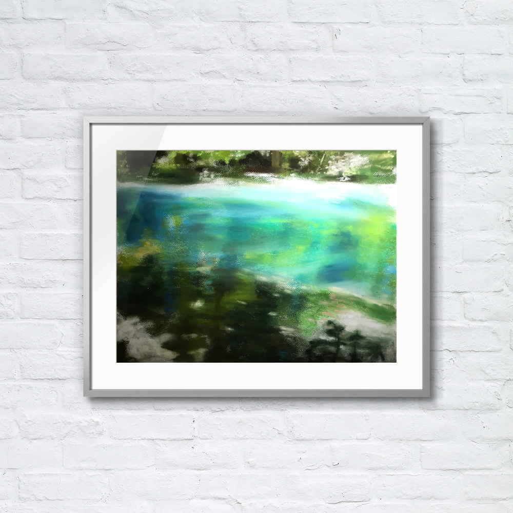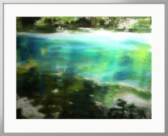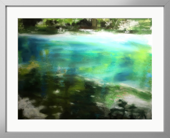 この作品は、ヨーロッパを旅していた時のスイスのインターラーケンに流れる川をモチーフに描いた作品です。豊かな森、高山から流れる川の水面は、エメラルドグリーン色でとても綺麗で神秘的でした。 水面に反射する光、色、透明感を大切に描いた作品です。