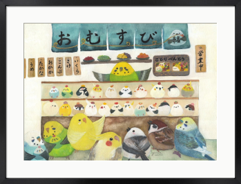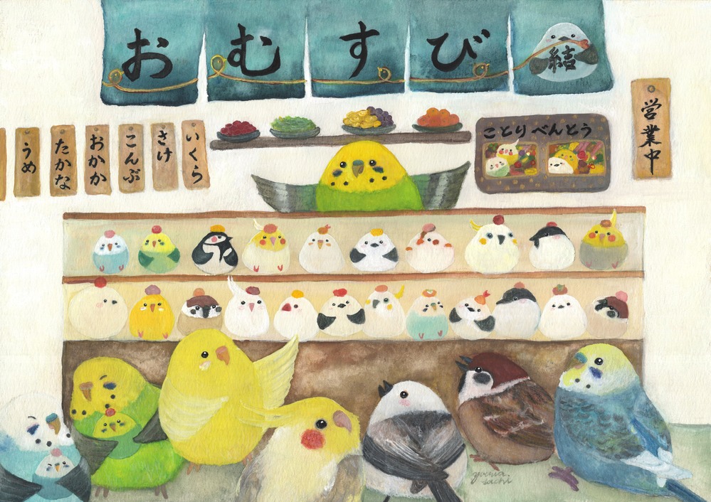 「御結び」良縁を結ぶとも言われているおむすびは縁起物とされてきました。人と人とのご縁を大切に。あたたかな気持ちになる1枚です。 ふんわりした雰囲気と愛らしい表情で、見る人を幸せにしてくれるおむすびインコ。 セキセイインコ シマエナガ セキセイインコ スズメ ~もしも小鳥たちの世界があったなら~ 小鳥たちの物語を自由に想像していただけましたら幸いです。