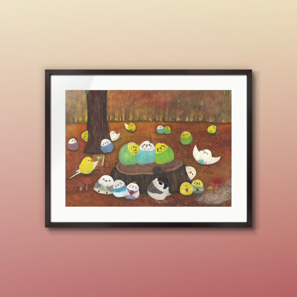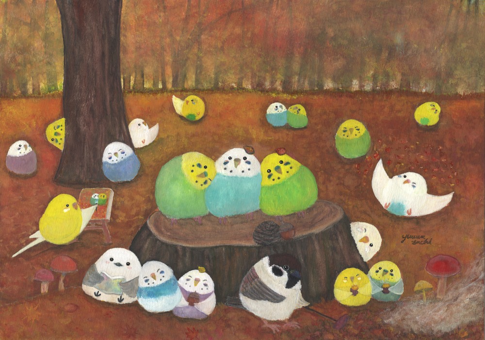 秋を楽しむ穏やかな表情の小鳥たち。 ~もしも小鳥たちの世界があったなら~ 小鳥たちの物語を自由に想像していただけましたら幸いです。 セキセイインコ スズメ シマエナガ