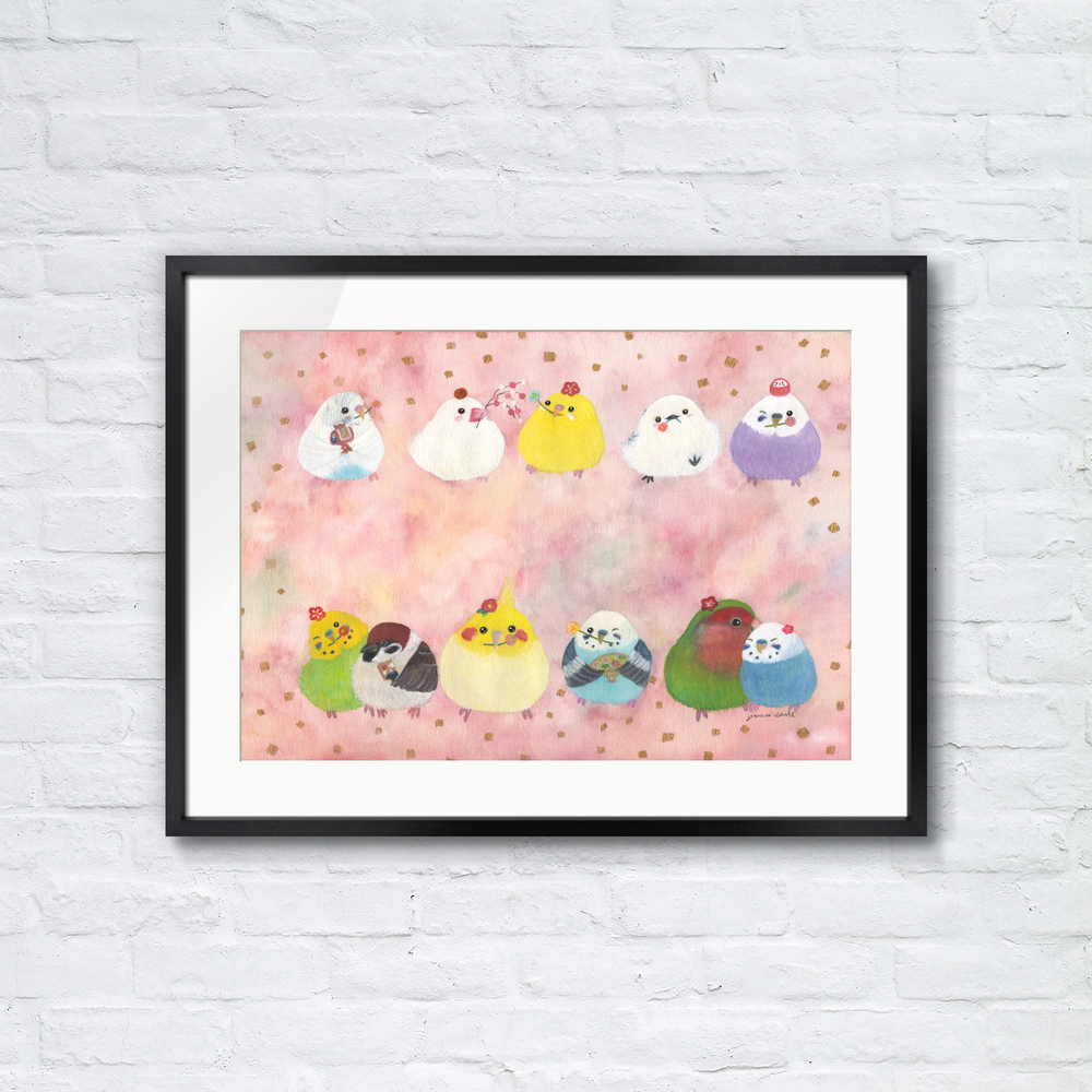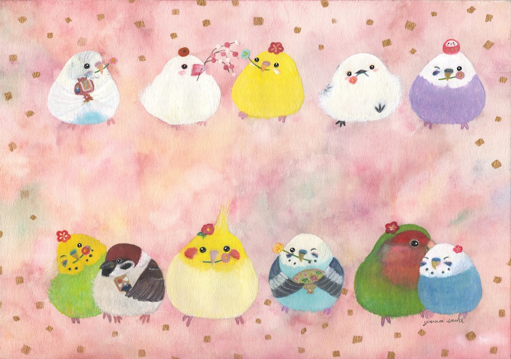 新たな年が幸せな一年になるよう、ふわふわの小鳥たちと縁起物を描いた心なごむ1枚です。 小鳥たちがふんわりと幸せを運んでくれる心温まる一枚です。 セキセイインコ オカメインコ スズメ シマエナガ コザクラインコ ~もしも小鳥たちの世界があったなら~ 小鳥たちの物語を自由に想像していただけましたら幸いです。