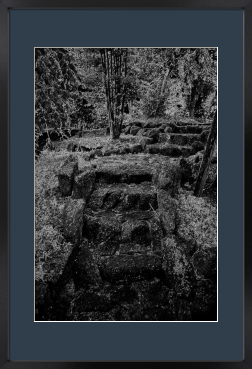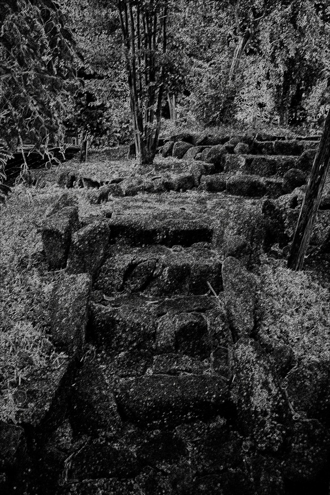 建物はコンクリート製、参道もアスファルト舗装になってしまったお寺ですが、境内の片隅に昔のままの参道が保存されていました。ゆっくりと歩いて上り、撮った写真をいくつかのレタッチソフトを使って、自分の記憶に深く刻まれた子供の頃よく遊んだ田舎のお寺さんの石段のイメージに近づけるべく加工しました。