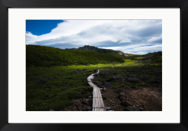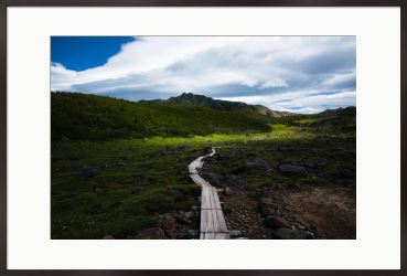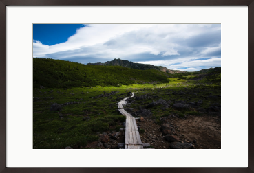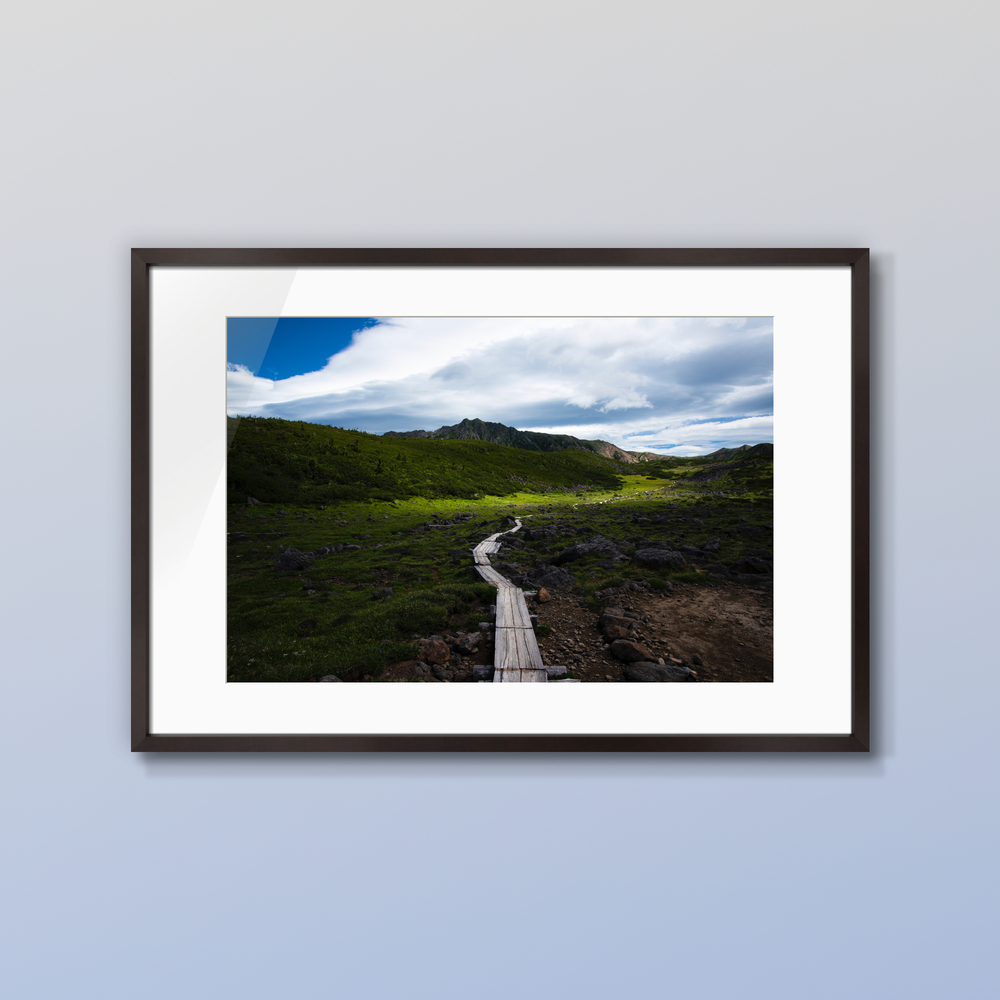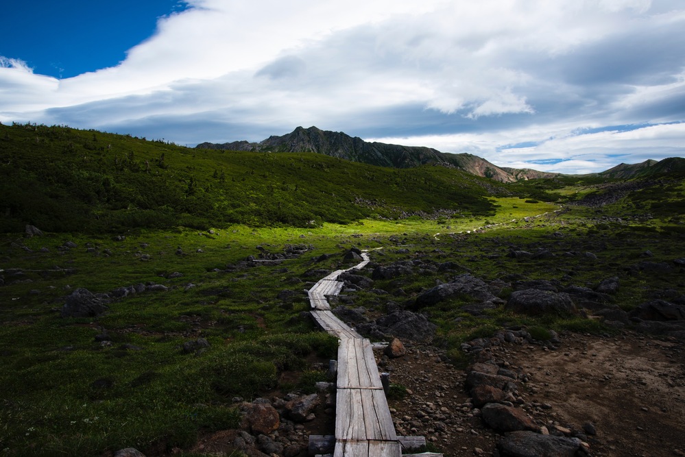 北アルプスでも最奥の地と言われる雲ノ平の高原を貫く木道。奥に聳えるのは標高2986mの水晶岳です。