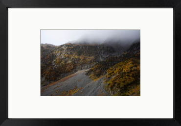 雲に包まれる穂高連峰の岩肌を捉えた一枚です。