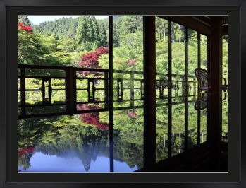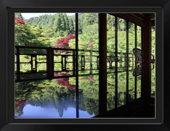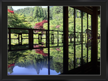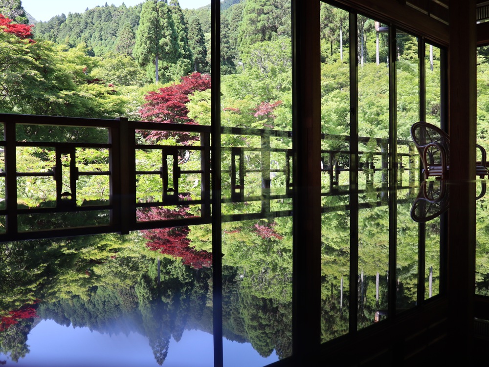 山荘「風遊山荘」2階の漆塗りテーブルに映り込む新緑と紅葉が、まるで鏡面世界のような幻想的リフレクションを生み出す——