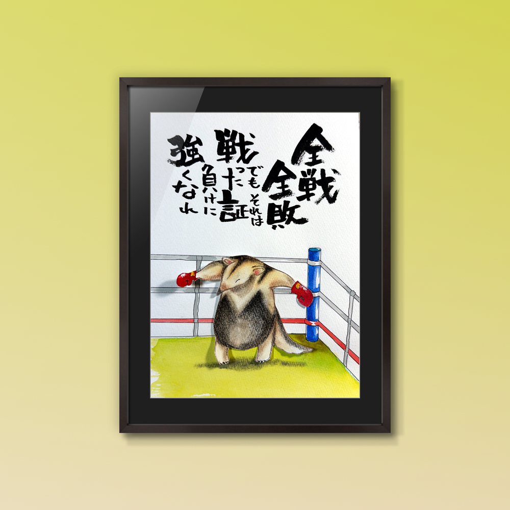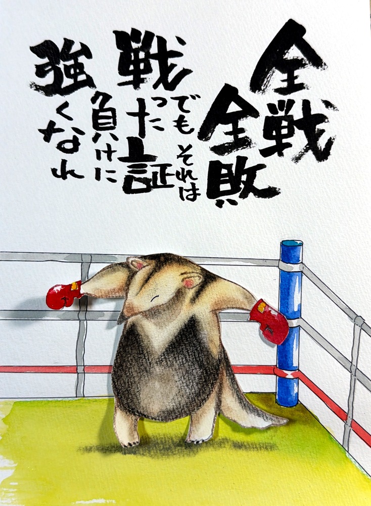 言葉とイラストオリジナルです 水彩と色鉛筆使ってます アリクイの威嚇って全然怖く無いでしょ 勝てそうに無いのに、向かう姿が大好きなんです