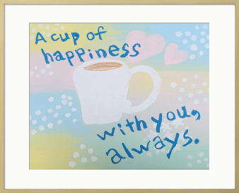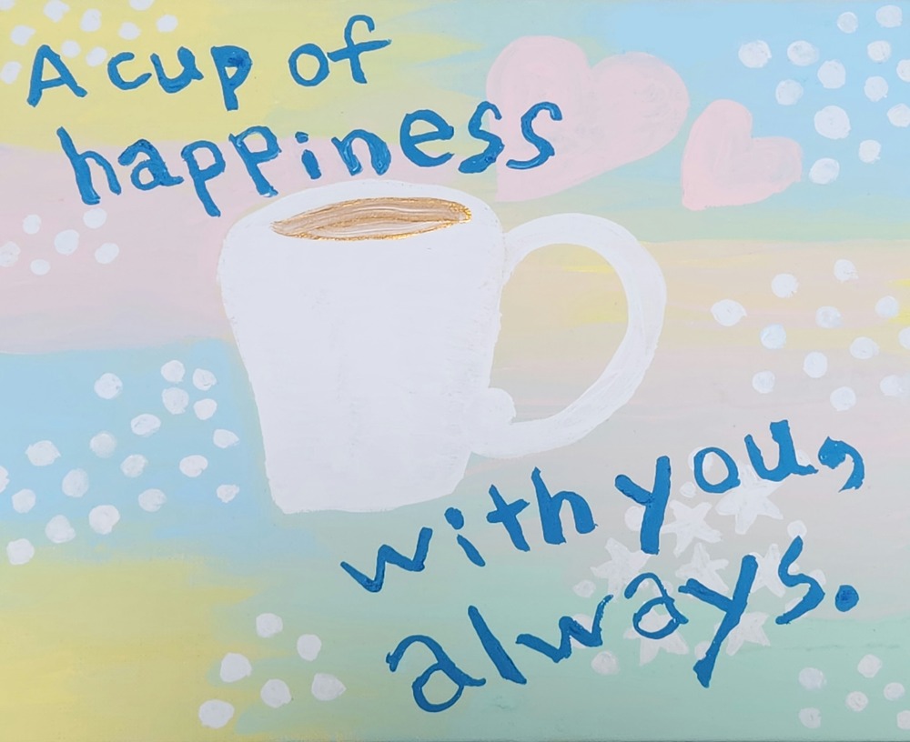 パステルカラーのかわいい色の背景に、マグカップを一つ。 やさしいカフェで幸せの一杯を飲んでいるような気分になれる絵です。