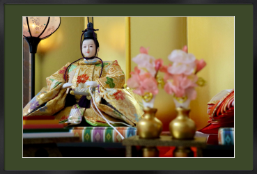 Title:桃の花を前景にした金屏風に映えるお内裏様男雛の上品な雛人形