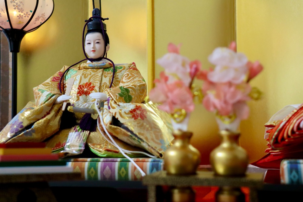 日本の誇る伝統的な雛人形のお内裏様を、桃の花越しに優しく捉えた和の美あふれる男雛の写真です。
