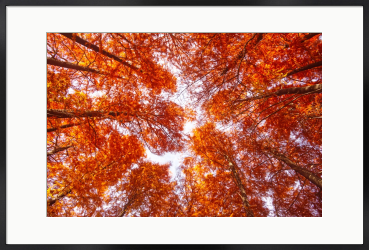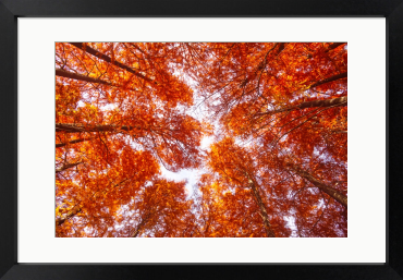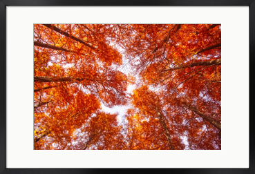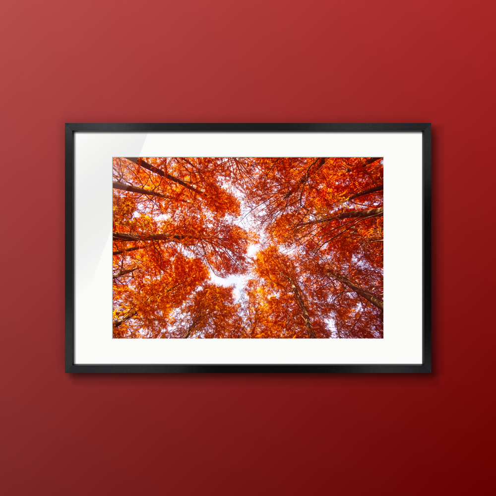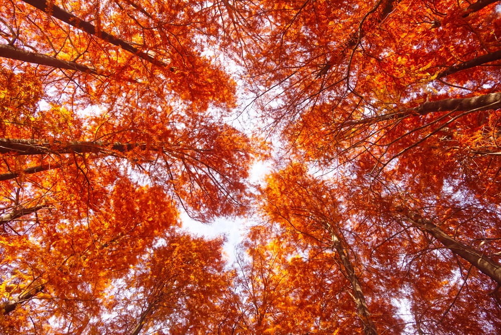 メタセコイアに囲まれた赤い空間から見上げたものです。 夕日も相まって黄金色にもなっており、吸い込まれるような世界を感じていただけたらと思います。