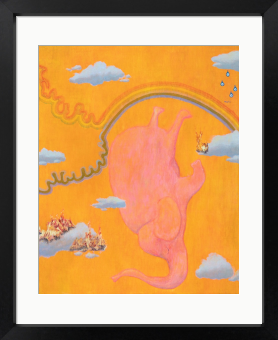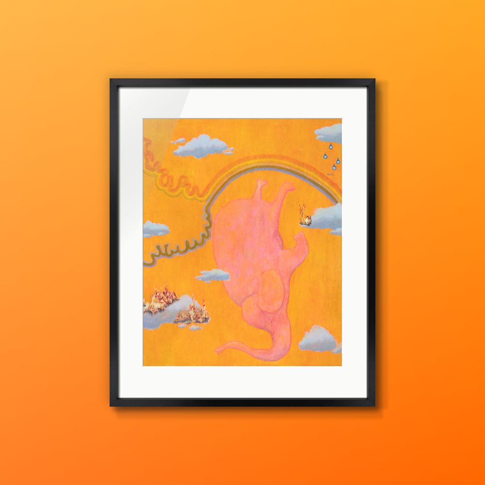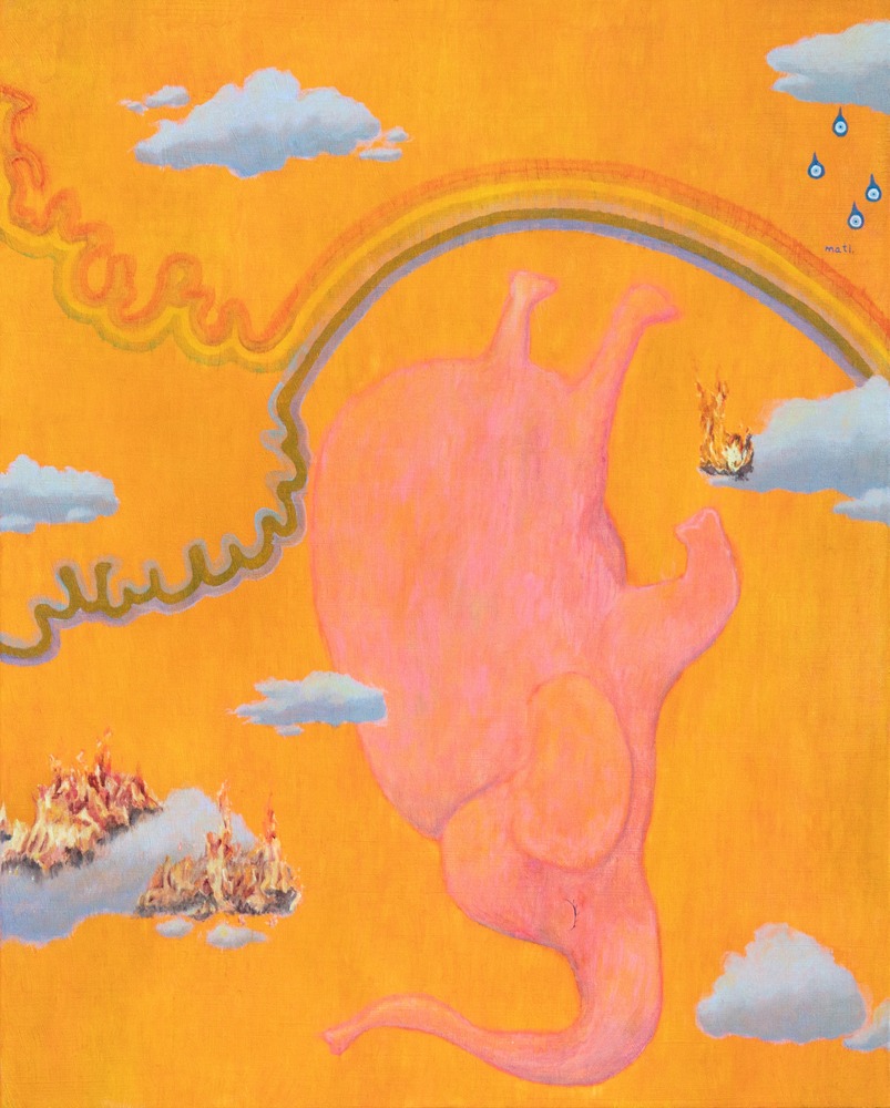 象が空から降ってきて、虹が屈折、雲は炎上、雨のmatiが覗きます。 おつゆ描きでえがきました。降る象β。