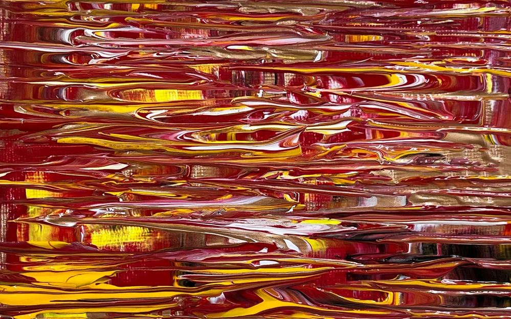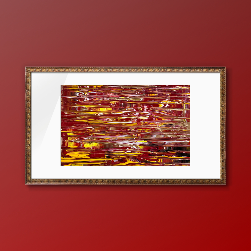 燃えるような赤と黄金の色彩が、優雅に流れるアクリル抽象画です。残り火のような温かな輝きが、心の奥に静かな情熱を灯します。日常に深い余韻とぬくもりを添える、文学的な一枚です。