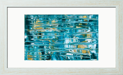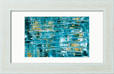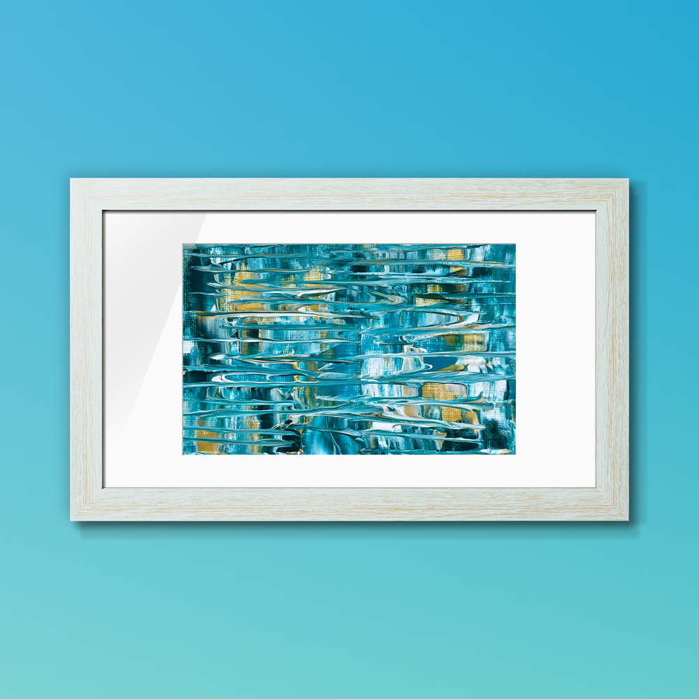 柔らかなターコイズブルーの層に、金色の光が優しく透けるアクリル抽象画です。海の深みから差し込む陽光のように、穏やかで希望に満ちた輝きが広がります。心に静かな癒やしを演出する、詩情あふれる一枚です。