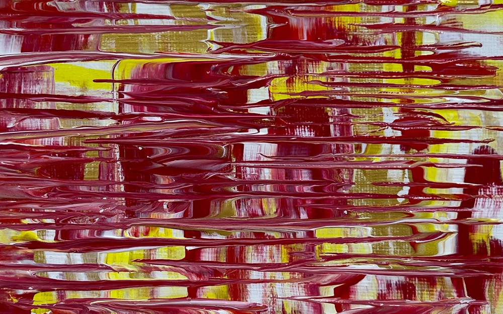 鮮やかな緋色と黄金の層が溶け合う、幻想的な夕焼けの情景を描いたアクリル抽象画です。流れるようなラインと独特のテクスチャーが調和し、見る者の心に温もりと感動を与えます。色彩の変化が生み出す豊かな表情は、空間に洗練された雰囲気をもたらし、特別なひとときを演出するアート作品です。