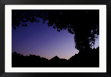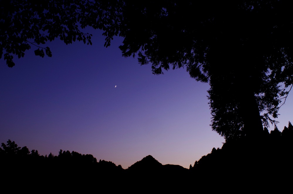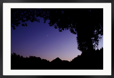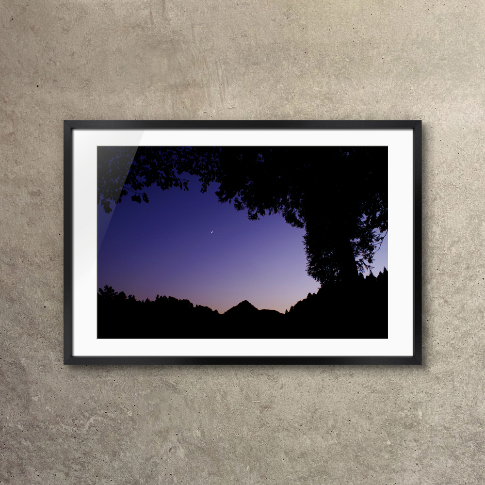 夕暮れの空に細く弧を描く月が現れた瞬間、時間が静かにほどけていくような感覚になりました。本作「弓張月」は、日が沈んだあとの淡い光と、夜の始まりを告げる月の存在が重なり合う、わずかな移ろいを捉えた作品です。山の稜線や木々の影がシルエットとなって浮かび上がり、自然が持つ静けさと奥行きをそっと示してくれます。空のグラデーションは、昼と夜の境界をやわらかく描き出し、私たちが普段見落としてしまう“静寂の瞬間”をそっと照らしていました。自然の中に身を置くと、言葉では説明できない気配や余韻が心に残ることがあります。この作品では、目に見える風景だけでなく、その背後にある空気の温度や、月が放つわずかな光の揺らぎまで写し取ることを意識しました。