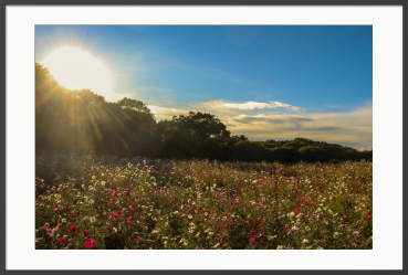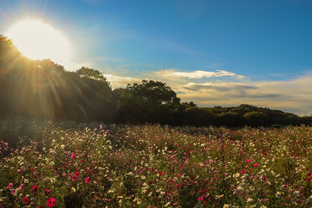 やわらかな午後の光が、コスモスの群れを静かに照らす。 白と紅が風に揺れ、森の稜線と広い空へと溶けていく。 季節の最盛と終わりの気配が同時に息づく、穏やかな秋の一瞬