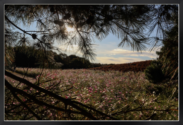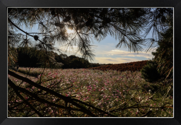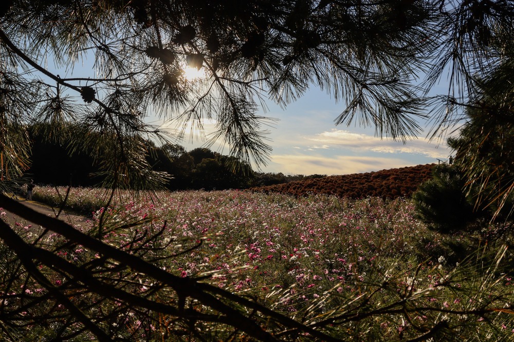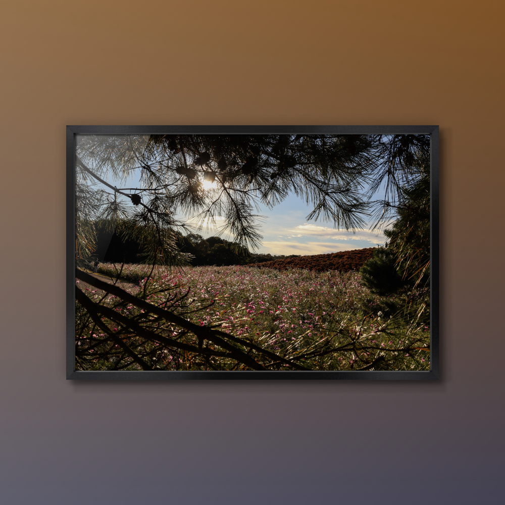 松の枝葉がつくる自然のフレーム越しに、柔らかな陽光を浴びて広がるコスモスの花畑。 影と光が重なり合い、季節の移ろいを静かに語りかける。 秋の深まりと穏やかな時間の流れを感じさせる一枚。