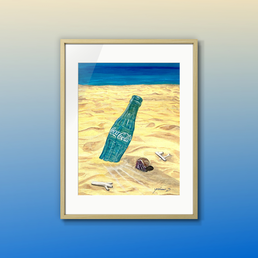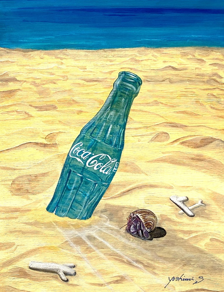 枝サンゴが混じる砂浜にコーラの瓶。その傍らにヤドカリがひとやすみ。人工物と自然のコラボレーションが生み出す景色。