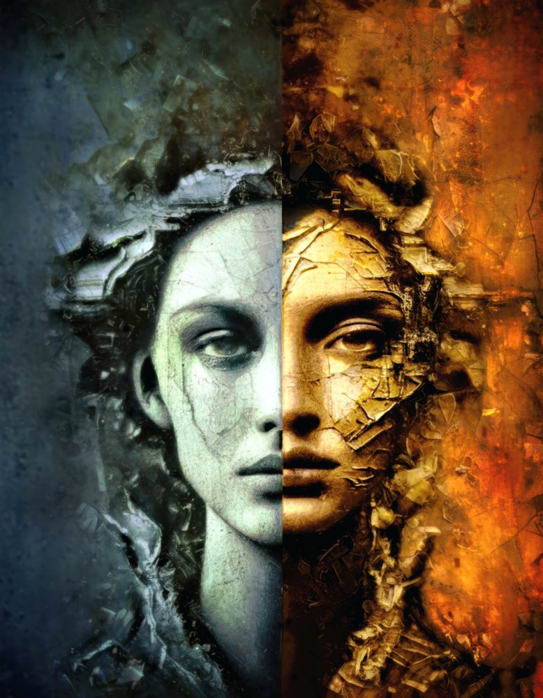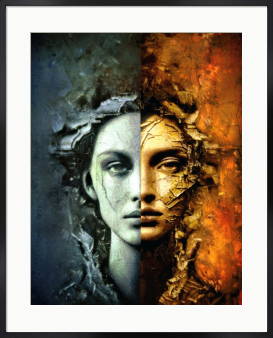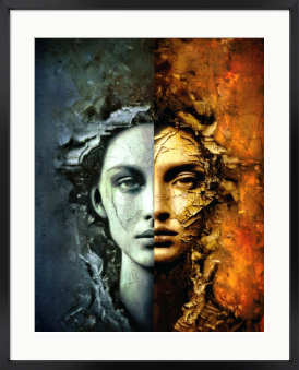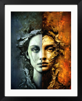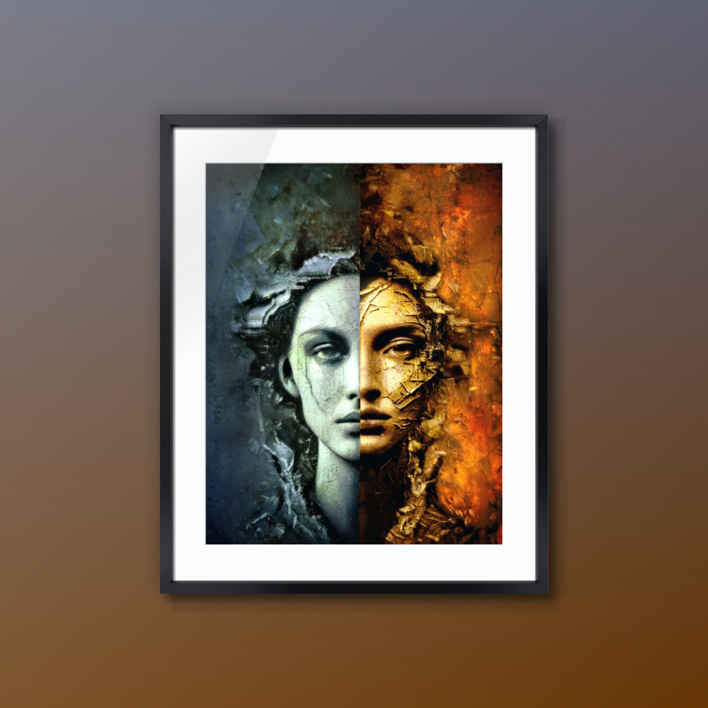 本作は人の魂に内在する「冷徹な理性」と「燃え盛る情熱」という 相反する二つの極を、一つの肖像として結晶化した作品です。