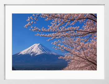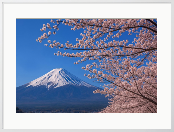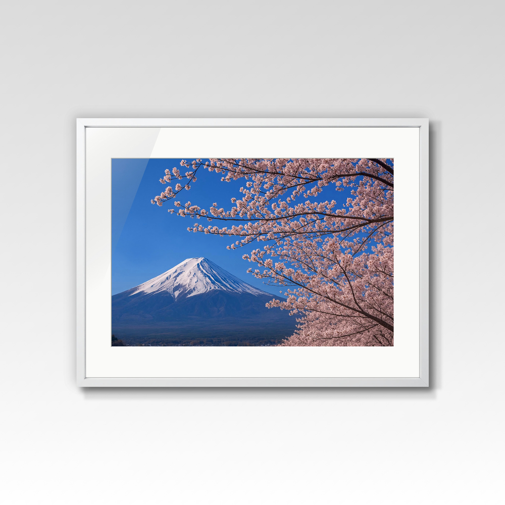 自分で撮影した写真をもとに、AIを用いて再調整し仕上げたフォトアートです。 光と色のニュアンスを丁寧に整え、桜と富士山の美しさを引き出しています。