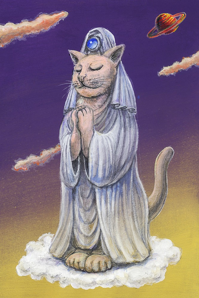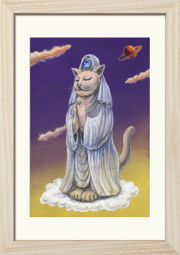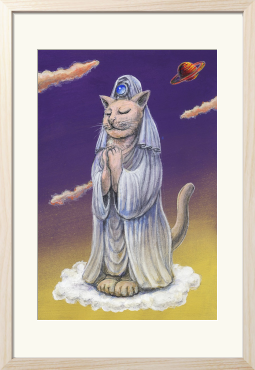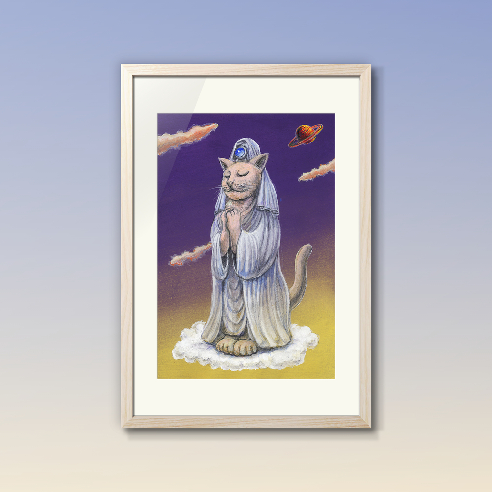 原画は水彩紙にアクリルガッシュ。“健康と平和”を願う「ねこ観音」です。