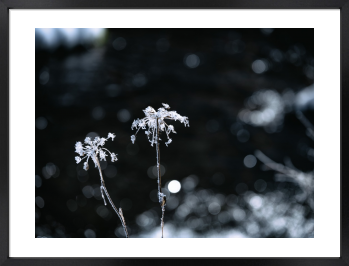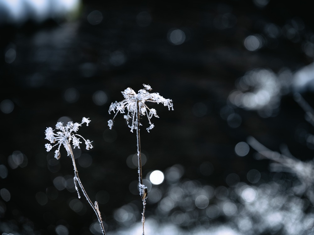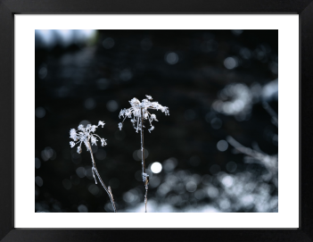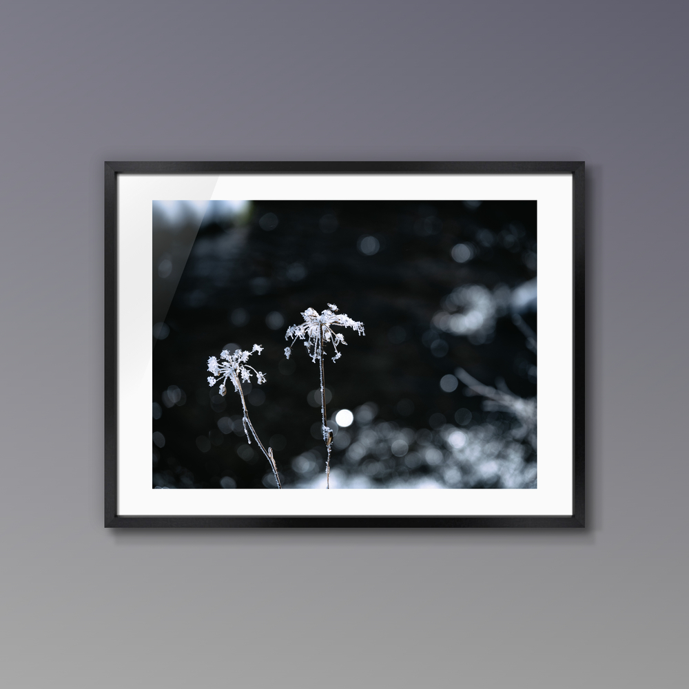 霜をまとったふたつの姿が、冷たい空気の中にとどまり、わずかな光を映している。 闇と静寂のあわいで、それは命の記憶のように立っていた。