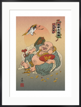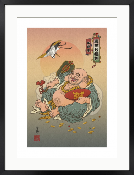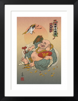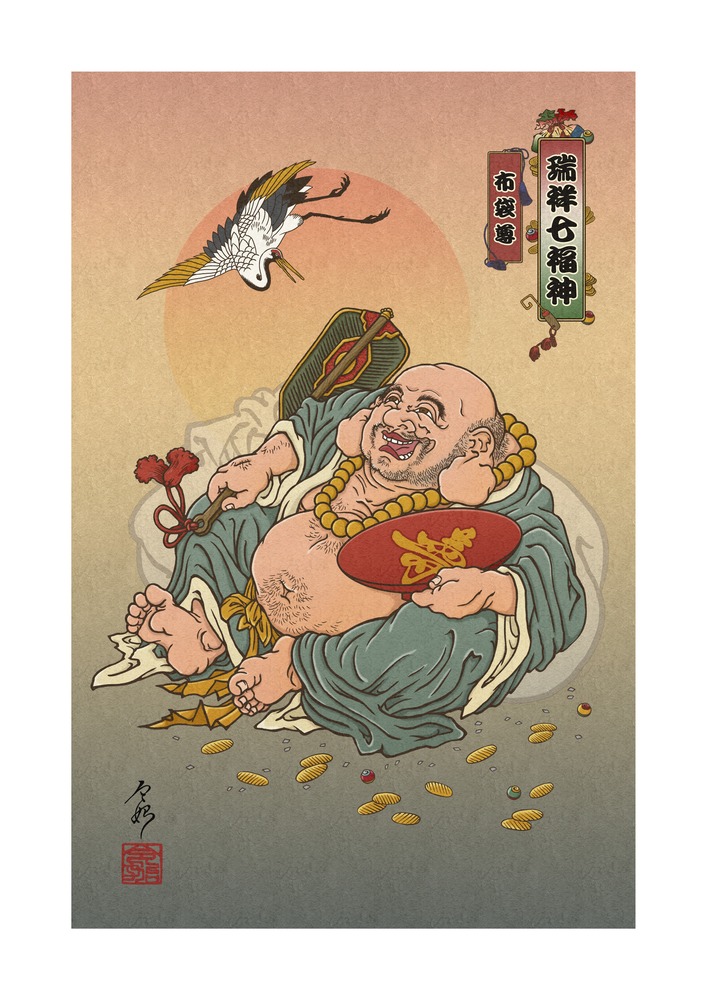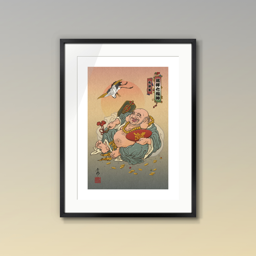 本作は、七福神という伝統的な主題を軸に、現代の感覚で構成された一図です。住まいの空間に穏やかな和みと、福が満ちていく気配をもたらす一枚となっています。